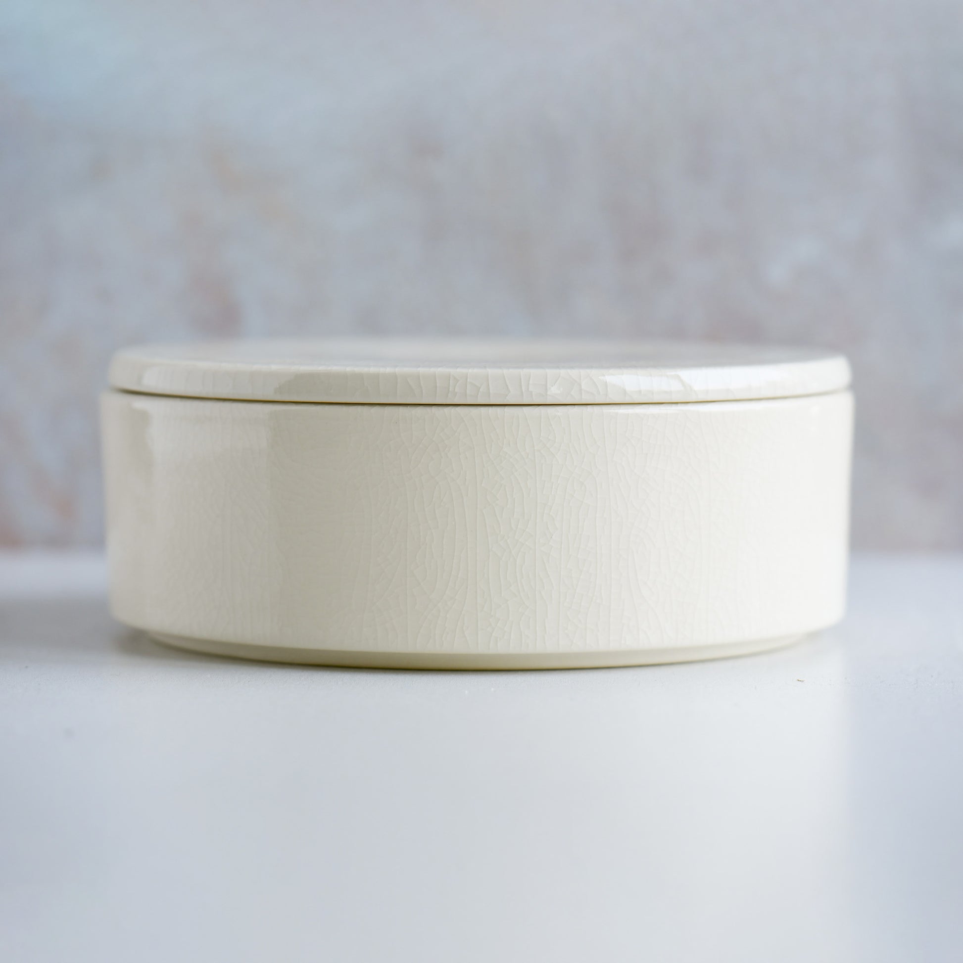 Discover the quiet sophistication of a modern Japanese ceramic bowl with a lid in a soft ivory tone. The fine kannyu (cracked glaze) forms naturally during firing, giving each bowl a unique texture that blends tradition and contemporary elegance. Perfect for dry treats or storing small items like jewelry or keys. To protect the finish, avoid liquids. Subtle and luxurious, this versatile piece embodies refined simplicity—an ideal accent for modern, design-conscious living.