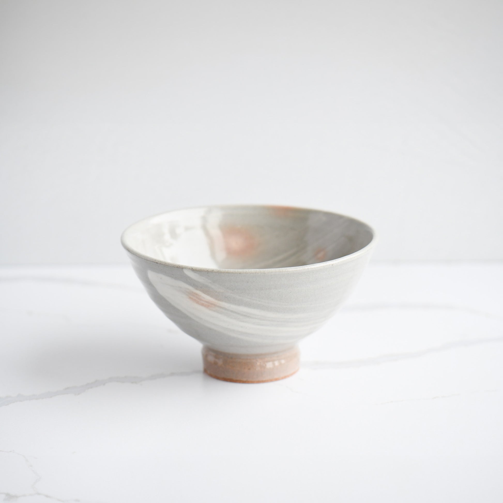 Elevate your dining experience with this exquisite bowl, featuring a unique brushed-stroke design. Each variation is adorned with slightly different glaze hues, embodying the blending of delicate gradients of light orange and gray. This diversity captures the essence of tradition and modernity. Inspired by wabi-sabi, the bowl celebrates beauty in imperfection and simplicity, evoking calm and tranquility. Perfect for any zen decor, its understated elegance complements any table setting. Skillfully crafted by Takeshi Honda, a master potter in Mashiko, Japan, every brushstroke is meticulous, offering a unique piece that embodies the spirit of wabi-sabi. This timeless treasure, ideal for any meal, adds elegance and serenity to your dining experience.