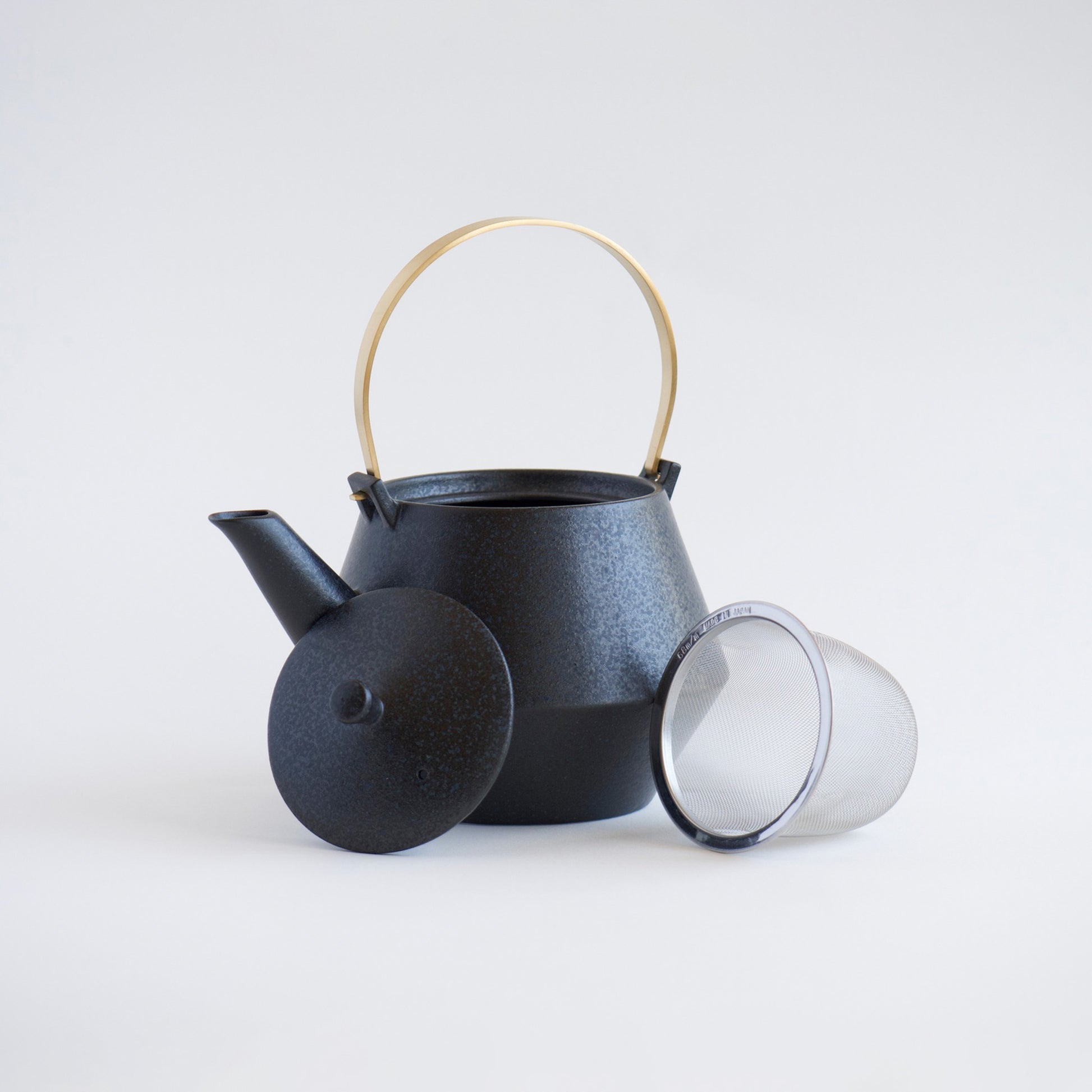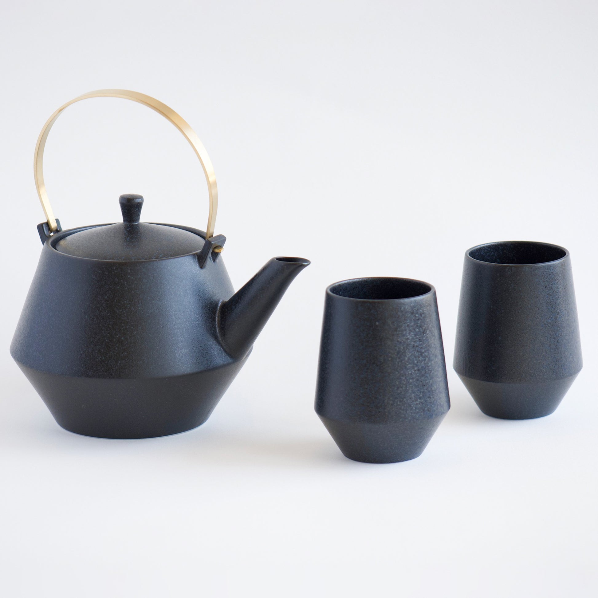 This Zen Teapot and Teacup Set is a perfect harmony of tradition and modernity. The teapot features a captivating, rugged, textured black body with a brass handle crafted in Tsubame, known for its metalworking excellence. Drawing inspiration from classic Japanese iron kettles, they embodied the teapot's midsection, an artful transition. Enjoy loose-leaf tea effortlessly with the included tea strainer. The two teacups mirror the teapot's texture, exuding understated elegance. Handcrafted in a historic Meiji-era kiln, these cups blend tradition with innovation. Elevate your tea experience with this stylish and thoughtful collection, embodying tranquility and sophistication.